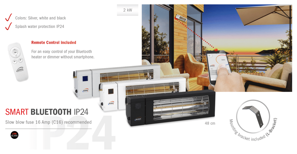 The compact and uncomplicated infrared heaters SMART from BURDA PerfectClime are a good choice, whenever and wehrever instant heating is required. The devices are protected against splash water and can be installed in any sheltered outdoor area on the wall, under the ceiling, on a tripod or under canopies. SMART infrared heaters also provide valuable services in commercial and industrial areas: whether for single-place heating or material heating and drying. The large reflector always ensures optimum heat output. The compact SMART series is produced exclusively in the high-quality LOW GLARE version. LOW GLARE describes a technical innovation in the production of the heating tube, which allows a significant reduction of the radiated infrared light. The advantage: SMART heaters can also be used wherever an atmospheric ambience without disturbing red light is to be created.